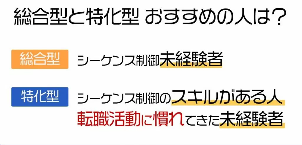 シーケンス制御未経験からの転職なら総合型。経験者の転職なら特化型がおすすめです。
