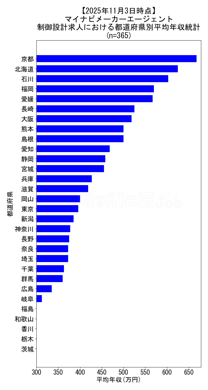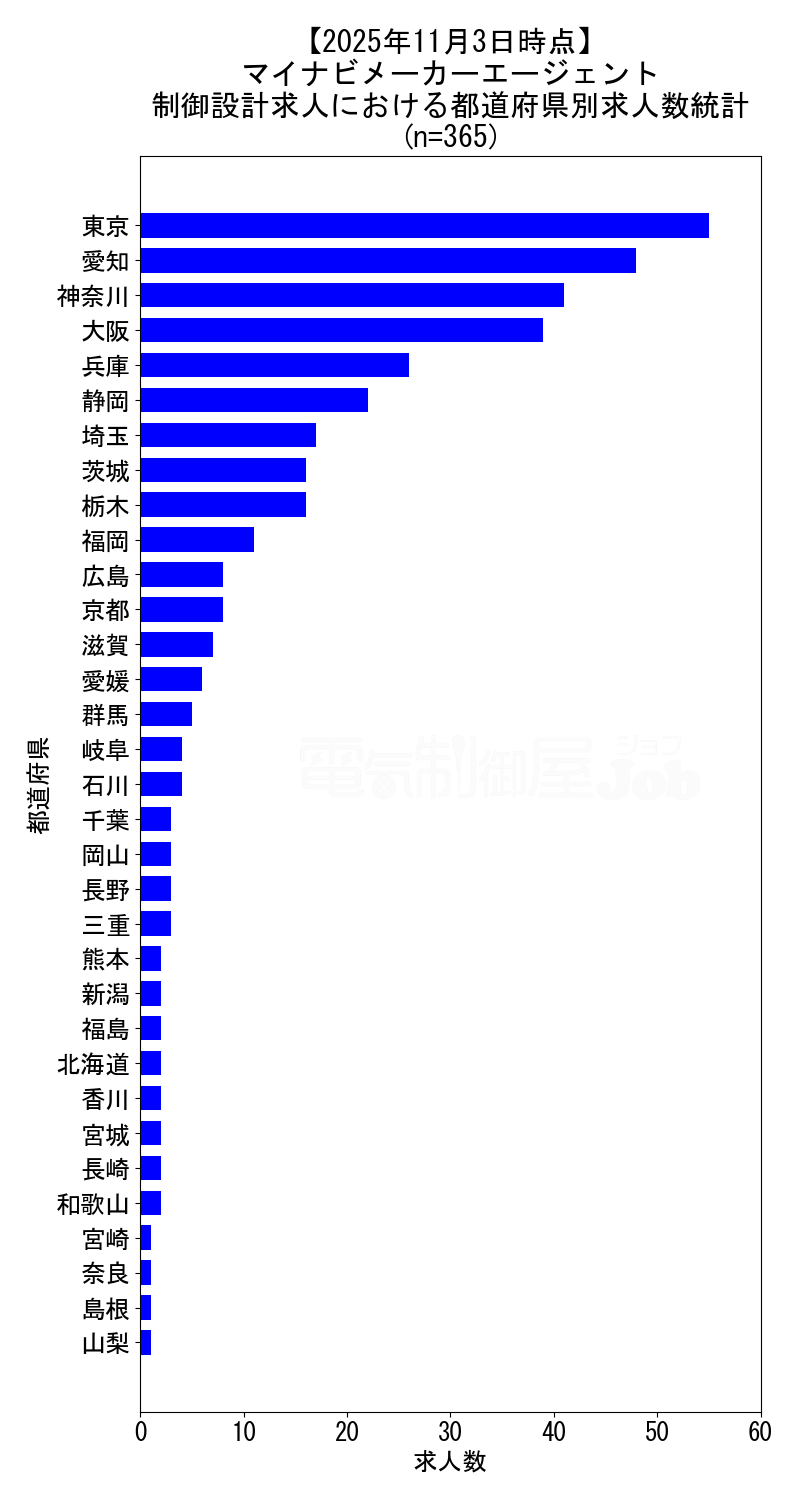 当サイトで定期的に調査しているマイナビメーカーエージェントの、2025年11月3日時点における制御設計求人集計データです。